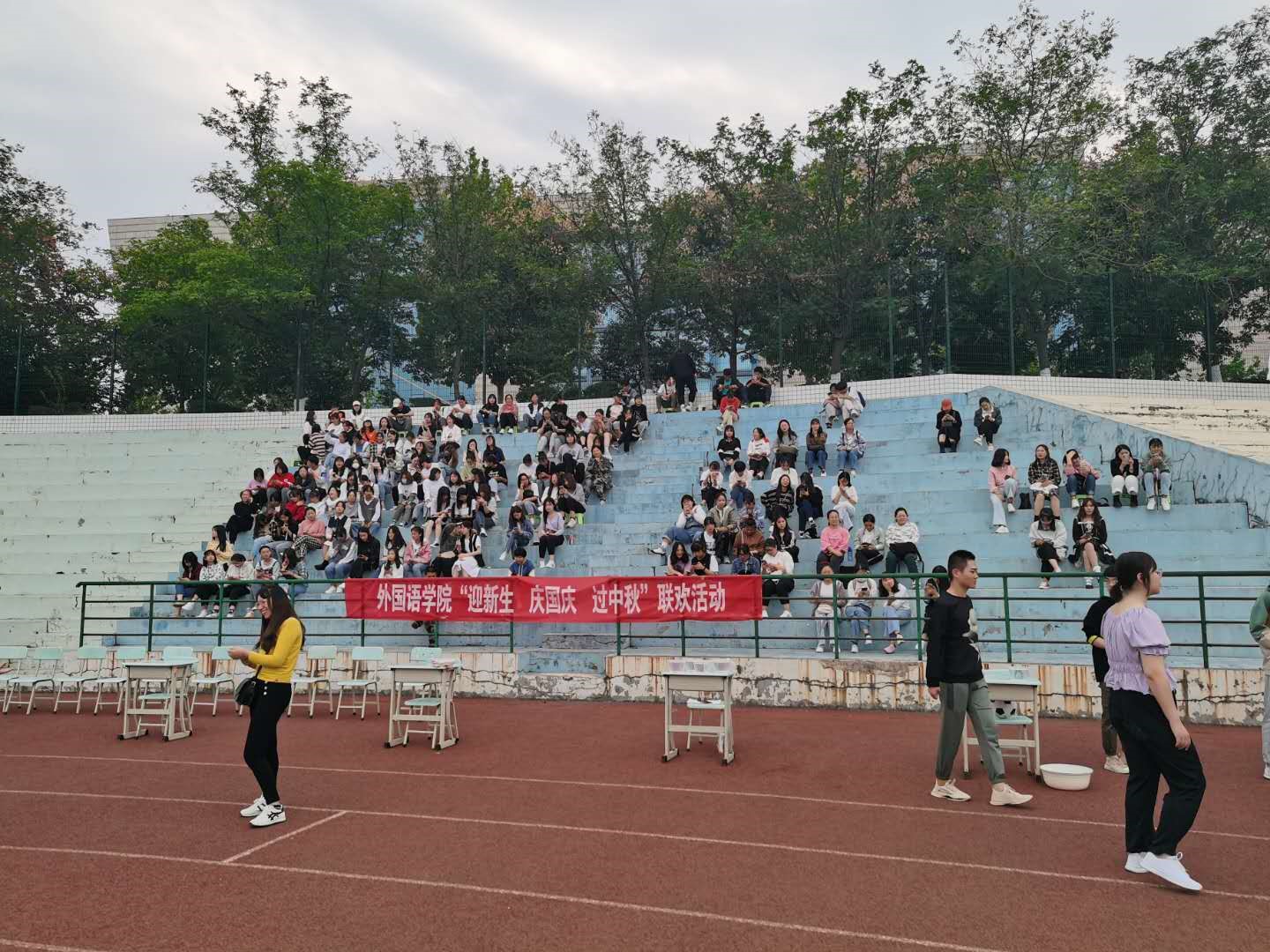 (通讯员 张雨梦 郭清连)2020级新生军训之际,国庆中秋喜相逢,举国欢庆月更明。10月1日,国庆与中秋双节到来之际,太阳成集团tyc122cc在田径场组织新生开展“迎新生、庆国庆过中秋”联欢活动。太阳成集团tyc122cc经理秦平新、副经理秦小锋、辅导员靳真真、新生班主任和全体大一新生参加了此次活动。