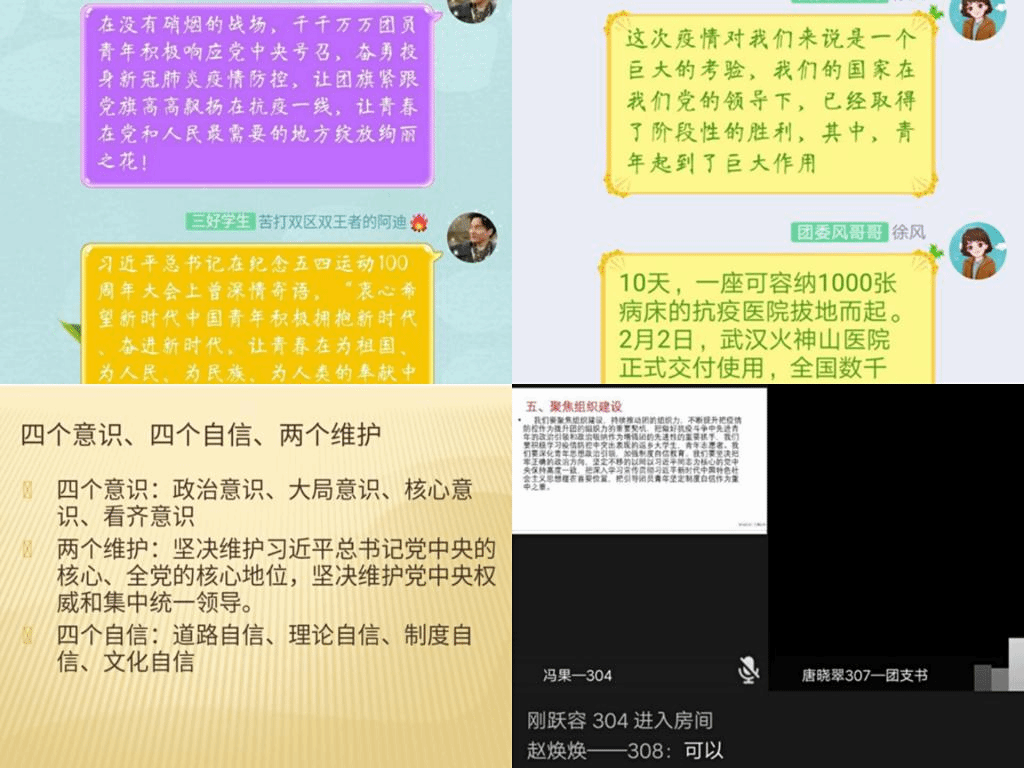 本次活动院团总支高度重视,首先在校团委文件精神的要求下,在征求班级团干、员工会团员干部意见的基础上,制定了活动方案,并由公司负责团务工作的辅导员靳真真向公司党总支副书记张换成做了工作汇报。其次,由公司员工会负责人杨晓芳带领全体团学干部召开工作部署会,传达文件精神,她强调各班团支书要认真带领本支部团员青年深入学习宣传贯彻总书记关于疫情防控工作的系列重要讲话和指示批示精神,认真贯彻落实总书记给北京大学援鄂医疗队全体“90后”党员的回信精神。团支书们根据本支部团员实际情况,灵活开展了活动;有进行直播的,也有进行接力承诺的,更多的是让团员们深入思考,在评论区参与讨论,并积极提出自我见解与总结。最后,各团支部进行了总结,公司团学干部纷纷表示,在抗疫的非常时期,大家会积极响应上级号召,督促广大团员不断加强思想道德修养,坚定制度自信,在抗疫期间,要始终保持积极的人生态度和良好的道德品质,争做担当大任的时代青年。