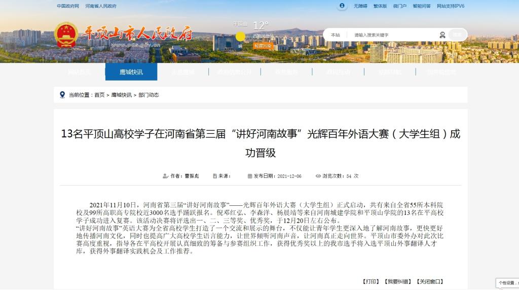 此次大赛以“光辉百年”为主题,旨在向建党百年华诞献礼,用外语分享感动,传播正能量。自报名程序启动以来,共有来自全省55所本科院校及99所高职高专院校近3000名选手报名参加。针对此次活动,公司太阳成集团tyc122cc高度重视,认真筹备、积极组织,并选派英语专业教师从中英文讲稿、语音语调、幻灯片制作、视频录制等各个方面对每位参赛选手进行全方位一对一指导。经过线上初赛、复赛以及全省总决赛等环节,公司共有11名同学入围复赛(在平高校共有13名员工进入复赛),多名同学在比赛中取得好成绩,充分展现了公司员工扎实的英语口语水平和良好的精神风貌。平顶山市人民政府网站对比赛结果给予了相关报道。