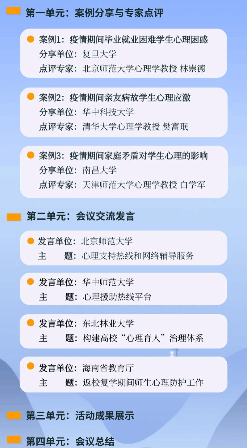 本次学习会议分为四个单元。第一个单元为案例分享与专家点评。复旦大学、华中科技大学和南昌大学的心理老师对疫情期间典型心理案例进行分析,北京师范大学林崇德教授、清华大学樊富珉教授和天津师范大学白学军教授就此进行精彩的点评。第二单元为会议交流发言,北京师范大学、华中师范大学、东北林业大学和海南省教育厅进行了主题发言,总结近期工作。第三单元为活动成果展示,用视频展示各高校疫情发生以来所做出的优秀成果。第四部分为会议总结,教育部思政司副司长张文斌进行了总结发言,对疫情发生以来的各公司的工作进行了总结,同时对疫情防控常态化背景下心理健康工作进行再部署。