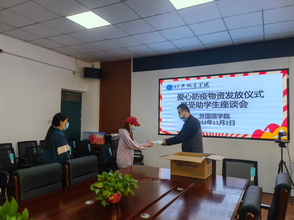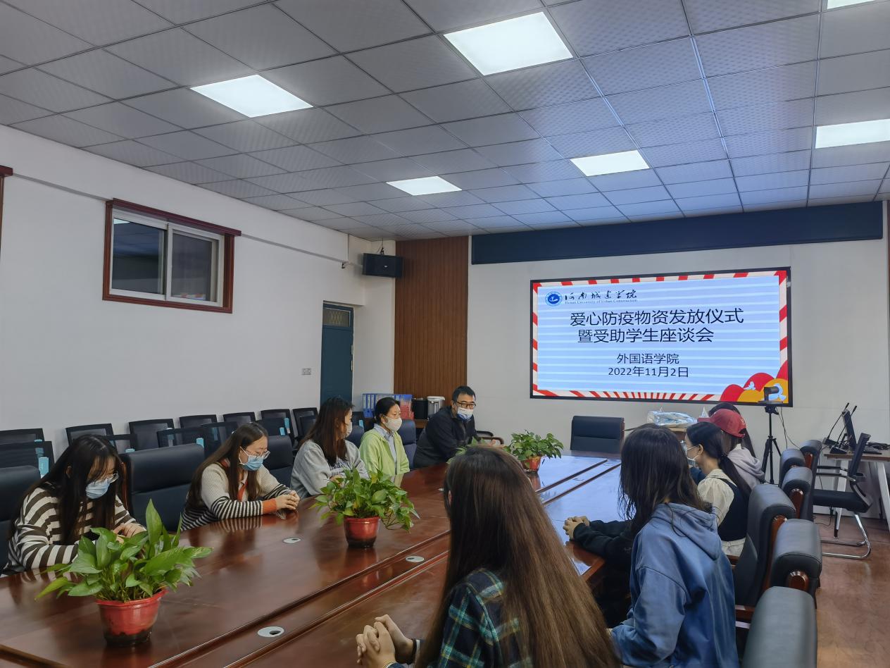 (通讯员:于瑞雪)为进一步落实公司资助政策,传递公司及公司对家庭经济困难员工的关爱,保障疫情防控期间困难员工做好自我防护,太阳成集团tyc122cc于11月2日下午在会议室举办了爱心防疫物资发放仪式暨受助员工座谈会。公司党委副书记胡思博、部分辅导员老师及受助员工代表参加了本次活动。