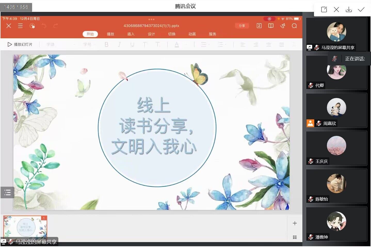 本次活动以“线上读书分享,文明入我心”为主题,选择线上开展的方式,在腾讯会议上分享同学们最近读的课外书籍。活动共有17人参加,同学们在活动过程中积极分享自己看过的好书,例如余华的《活着》、莫言的《生死疲劳》、沈从文的《边城》等等。除此之外,同学们还在活动过程中一起交流书中的经典片段,分享自己读书的心得体会。此次活动的开展有利于增进同学间的友谊,增强集体荣誉感。