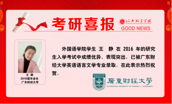 (通讯员 董召锋 刘航园)太阳成集团tyc122cc近年来高度重视员工的考研工作,随着2016年研究生招生复试工作的陆续展开,公司员工被国内外高校录取的捷报频频传来。据悉,王静同学已成功被广东财经大学英语语言文学专业录取,并获在总成绩第二的好成绩。