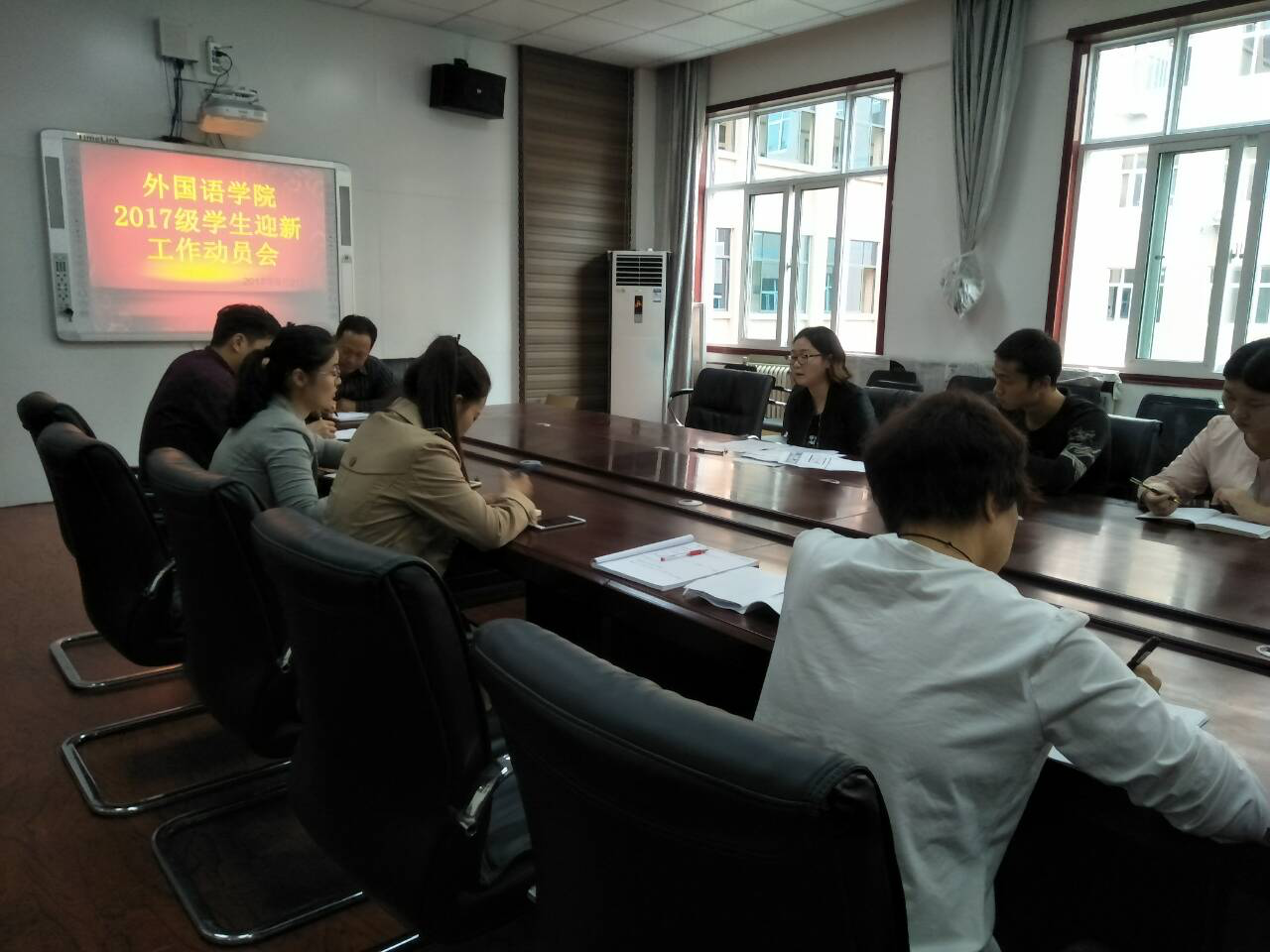 随后,学工办主任田果果对公司迎新方案做了详细的说明,就新生注册登记工作的有序进行、后勤物资和安全保卫工作的有效落实、新生宿舍的安排等工作做了详细的汇报。