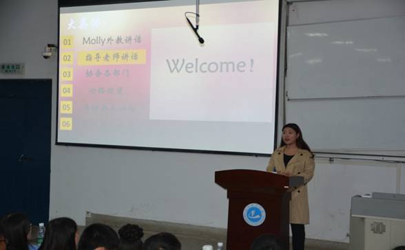 活动伊始,英语协会会长张威威宣布见面会开始。随后,外教MOlly发言,详细介绍了英语的重要性及学习方法。然后,张瑞博分享自己英语学习心得。活动期间,英语协会新成员分别进行了自我介绍,并进行才艺展示,获得阵阵掌声。整个过程气氛异常活跃。最后英语协会各部门部长进行发言,介绍各个协会部门职能并简单介绍本部成员。