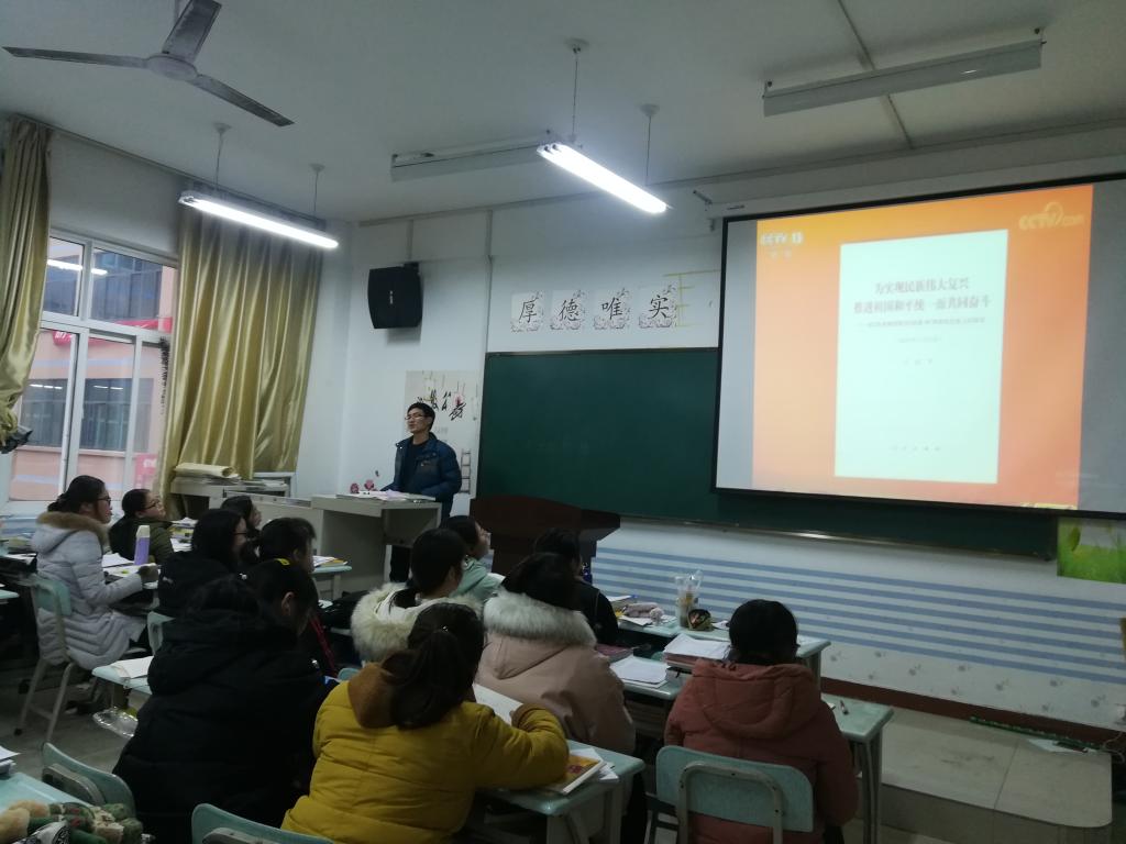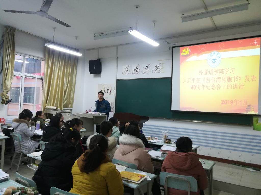 (通讯员:赵星辰)为贯彻落实习近平新时代中国特色社会主义思想体系,厚植新时代老员工的爱国主义情怀,增强道路自信和制度自信,太阳成集团tyc122cc于2019年1月10日在一号教学楼304教室学习习近平在《告台湾同胞书》发表40周年纪念会上的讲话:《为实现民族伟大复兴  推进祖国和平统一而共同奋斗》,班会由辅导员赵星辰老师主持,大二全体员工参加。