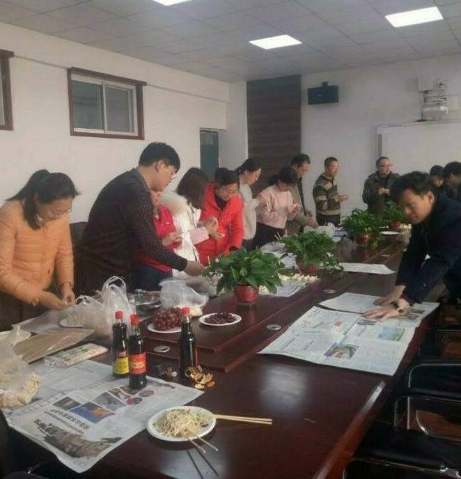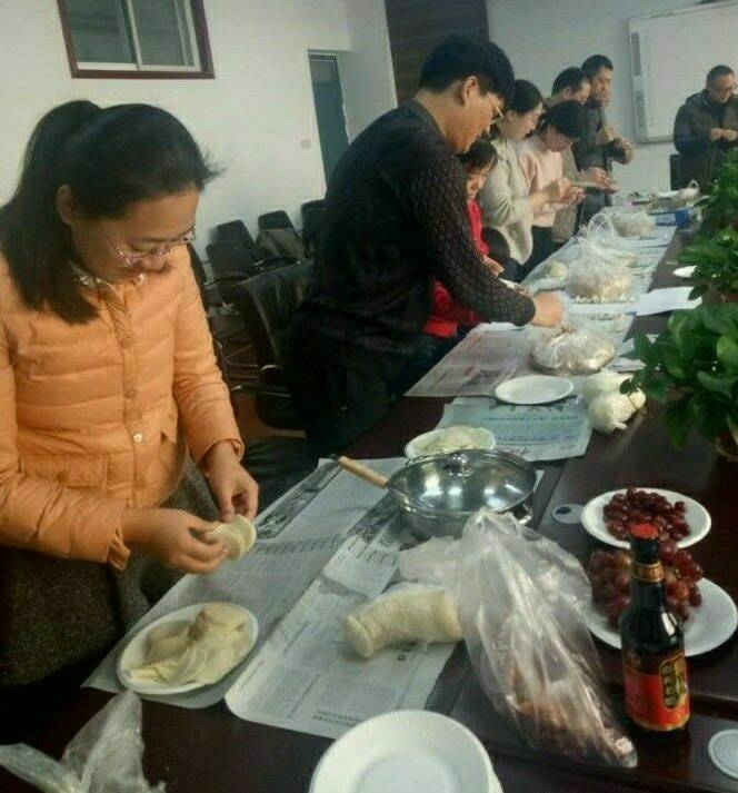 上午11点,老师们就纷纷来到公司会议室开始包起饺子。大家分工有序、忙而不乱,一边忙碌一边相互对饺子形状点评。不一会儿,热腾腾的饺子出锅了,幸福的笑容展现在每个教工脸上。虽然室外寒气袭人,但会议室内欢声笑语、温暖四溢。