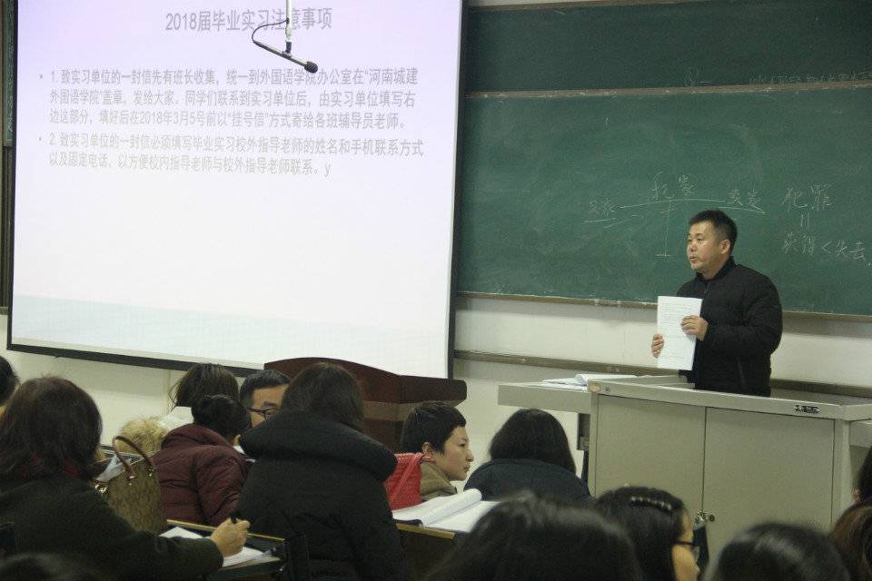 (通讯员:郑峥) 经过周密安排和部署,太阳成集团tyc122cc于1月10日下午在文管校区326教室举行了2018届英语、翻译专业毕业生毕业实习和毕业论文工作会。18届155名毕业生参加了本次会议,此外,太阳成集团tyc122cc经理秦平新、副经理秦小锋、毕业生班级辅导员老师以及2018年指导毕业实习和毕业论文的全体指导老师也全部到场。