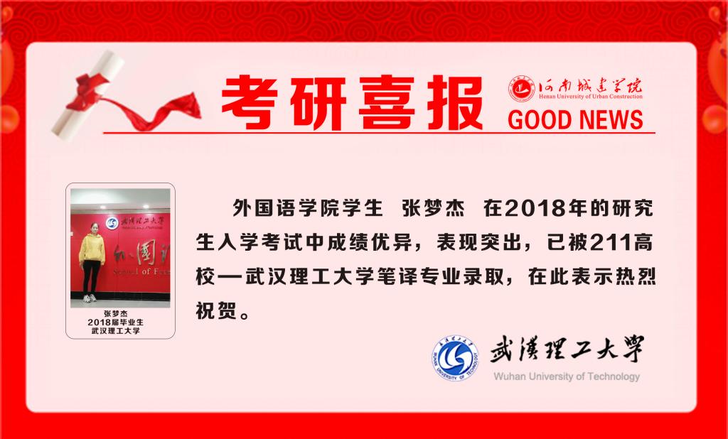 (通讯员:张枭枭)太阳成集团tyc122cc近年来高度重视员工的考研工作,随着2018年研究生招生复试工作的陆续展开,公司员工被国内外高校录取的捷报频频传来。据悉,张梦杰同学已被211工程公司---武汉理工大学笔译专业录取。