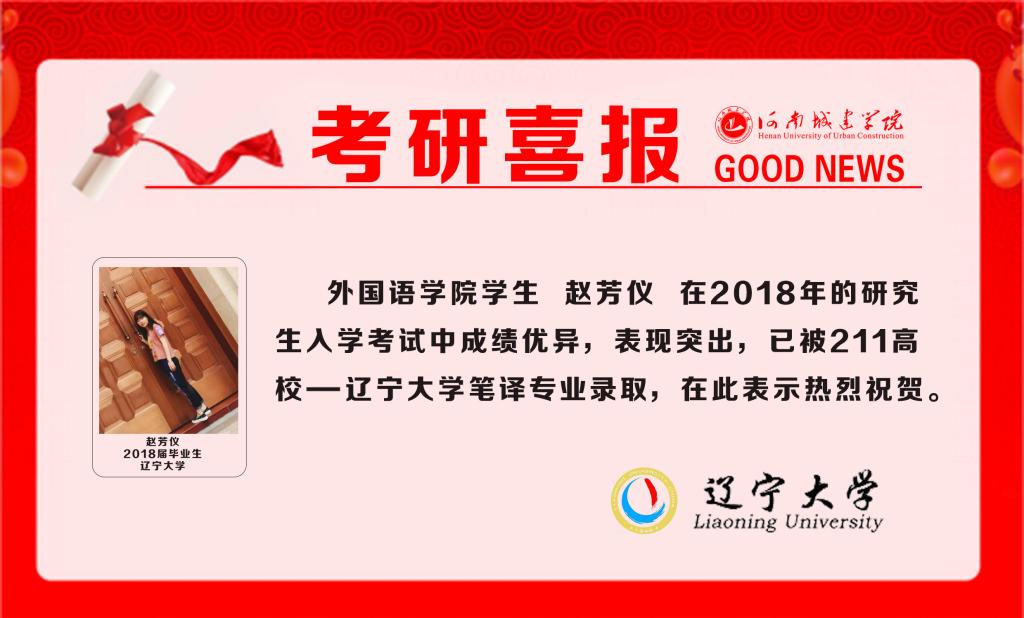 (通讯员:张枭枭)太阳成集团tyc122cc近年来高度重视员工的考研工作,随着2018年研究生招生复试工作的陆续展开,公司员工被国内外高校录取的捷报频频传来。据悉,赵芳仪同学已成功被“211工程”高校——辽宁大学英语笔译专业录取。
