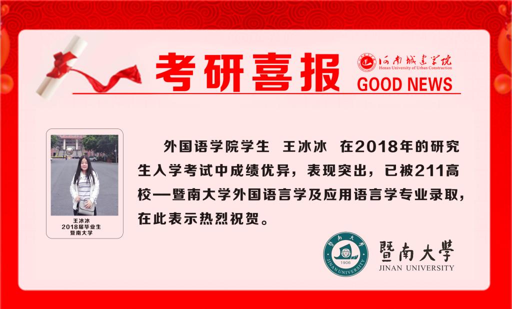 (通讯员:张枭枭)太阳成集团tyc122cc近年来高度重视员工的考研工作,随着2018年研究生招生复试工作的陆续展开,公司员工被国内外高校录取的捷报频频传来。据悉,王冰冰同学已被211工程公司---暨南大学外国语言学及应用语言学专业录取,并获取综合排名第7的优异成绩。