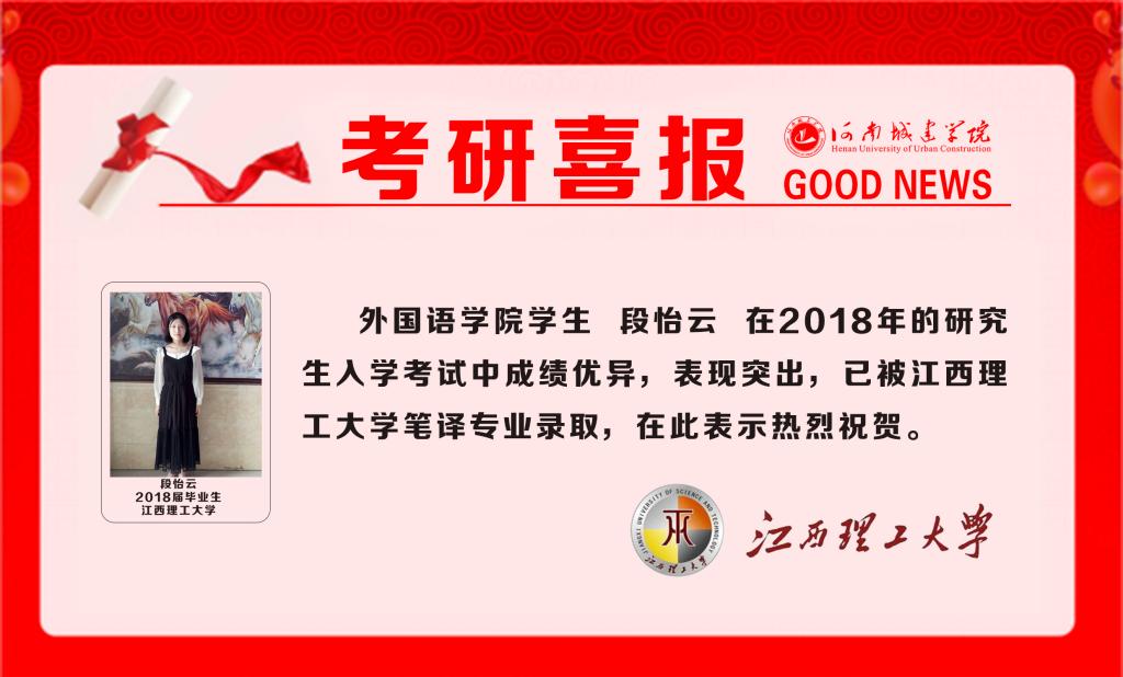 2018年研究生招生复试工作的陆续展开,公司员工被国内外高校录取的捷报频频传来。据悉,段怡云同学已成功被江西理工大学笔译专业录取。