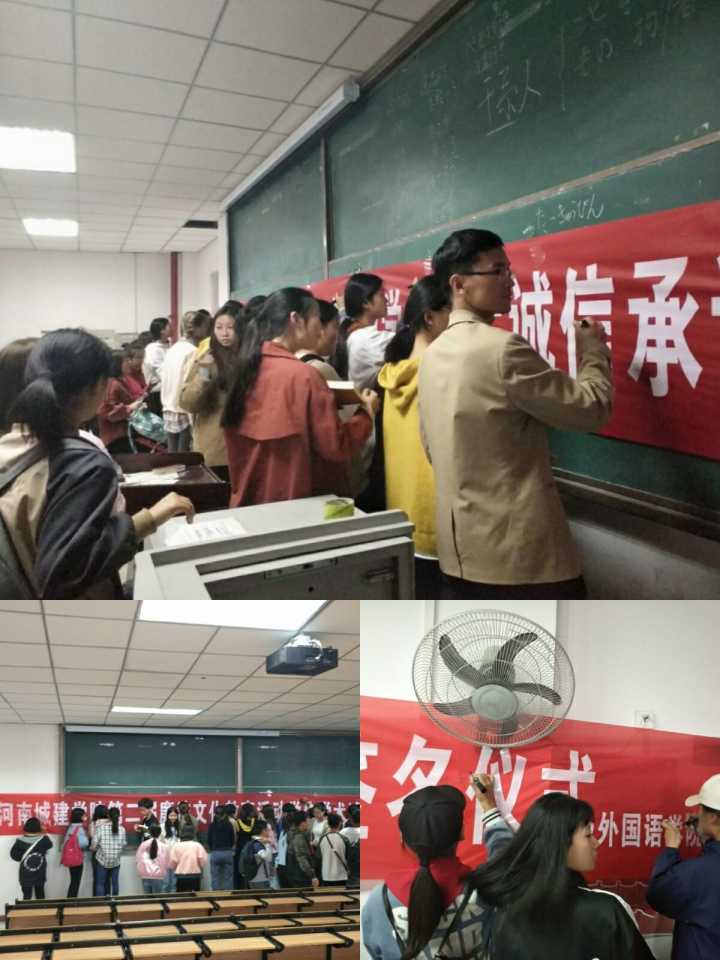 活动当天,公司志愿者在326教室将横幅悬挂起来并准备好黑色笔。9点30分活动正式开始,公司员工有序来到326教室进行签名,志愿者积极宣传诚信在老员工活、考试和交友中的重要性。活动结束后,同学们纷纷表示:诚信不仅是传统美德,更是做人准则,今后一定要诚信做人、诚信做事、诚信考试、诚信生活。