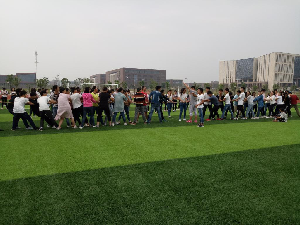 首先进行的活动是拔河比赛,同学们分别组成了十支队伍,每队派出一名代表进行抽签,数字相同的两支队伍为对抗组。当比赛的哨声响起,队员们口中一起高呼“一二、一二”, 双手紧握长绳,憋足了劲拼命往后拉,其余的同学们为他们加油助威。获胜方获得了精美礼品。第二个活动是接力比赛,十支队伍分成两组进行比赛。赛场上,同学们你追我赶,一次次将手中的接力棒传到下一个人的手中,现场氛围十分活跃。比赛前三名获得了精美礼品。