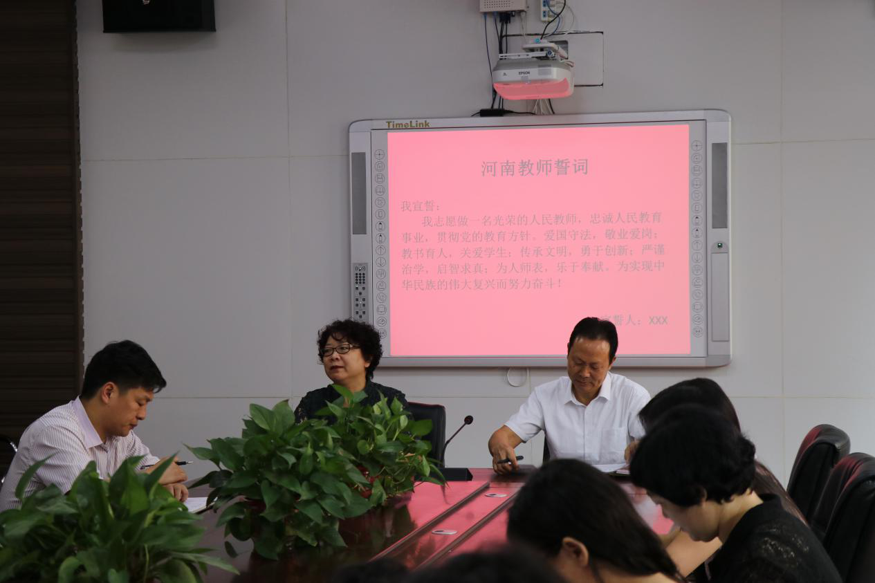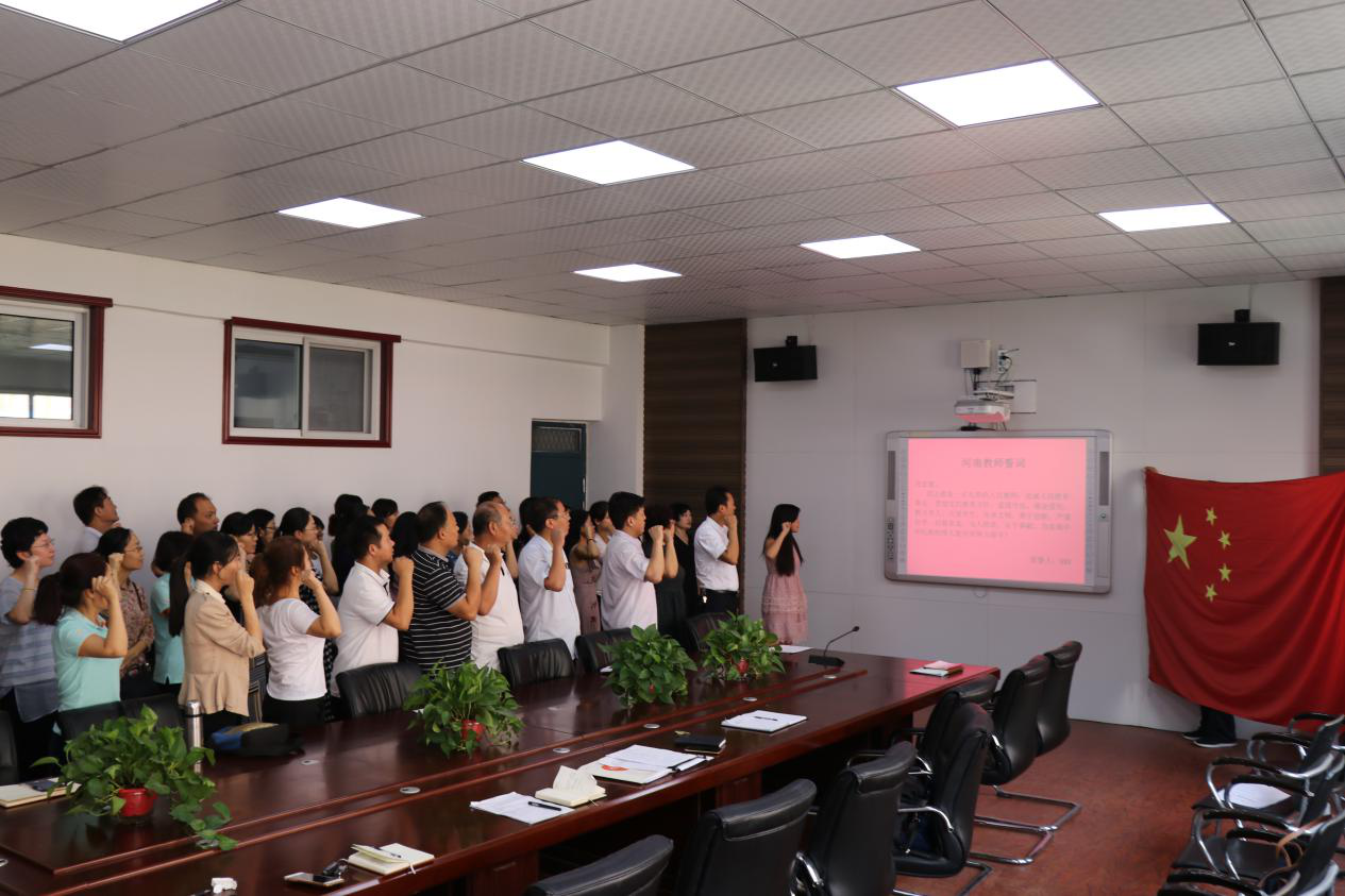 会议最后,为迎接第34个教师节的来临,强化教师的立德树人意识,太阳成集团tyc122cc全体教职工进行了重温“河南教师誓词”活动。