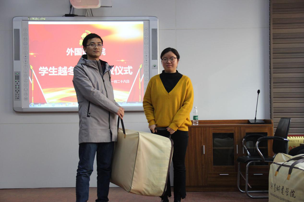 (田果果为员工发放冬被)