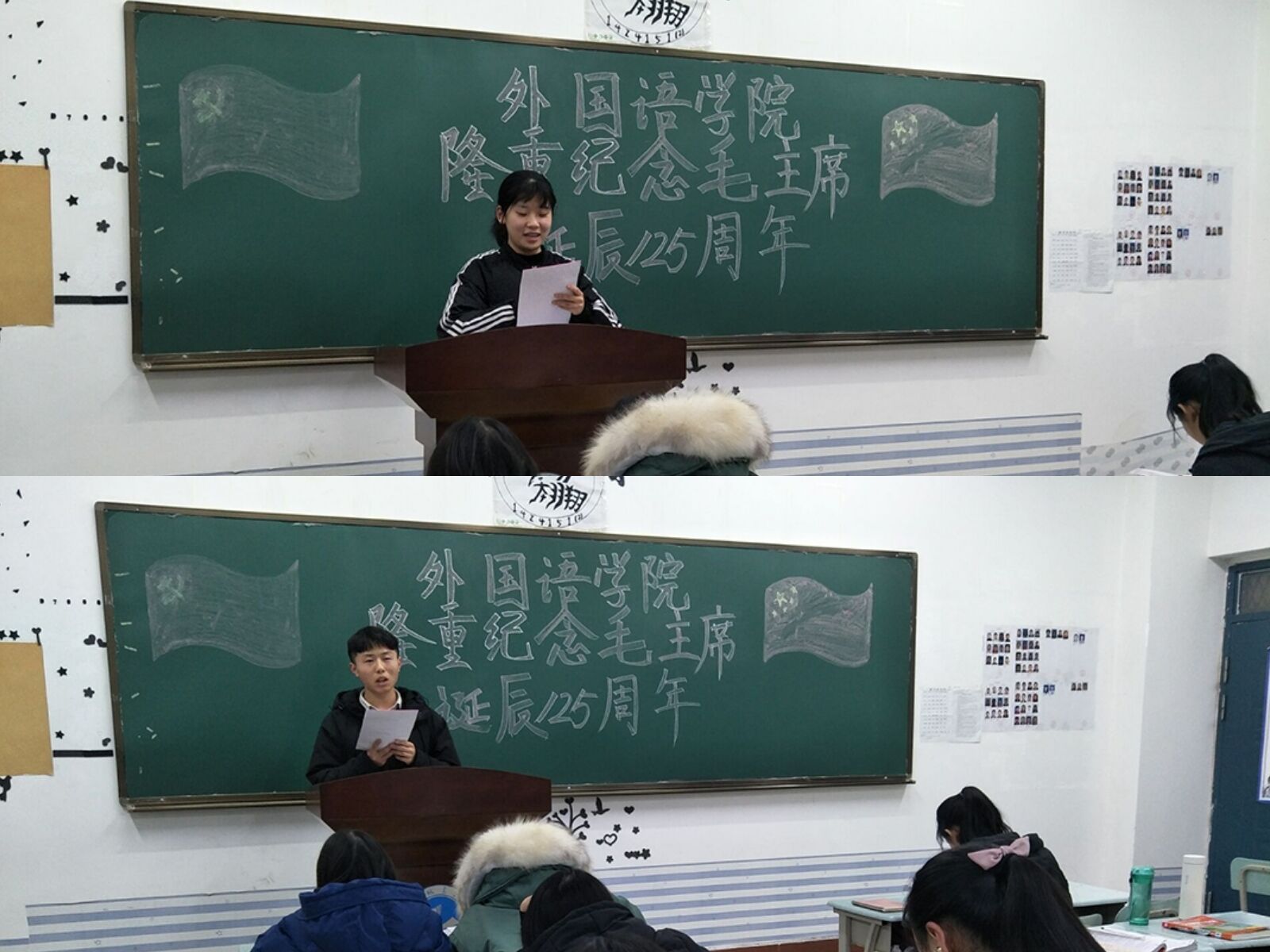 赵星辰老师给同学们讲述了毛泽东出身农民家庭,在长沙勤奋刻苦的求员工涯,投身农民运动,建立共产主义组织,建立井冈山革命根据地,建立中华苏维埃共和国等先进事迹。然后邀请熊思瑶和陈曦鹏做主题演讲:“纪念伟大领袖毛主席”,演讲者激昂澎湃的情绪感染了在场的每一个同学。最后是进行毛主席诗词默写大赛,熊思瑶、陈曦鹏、赵晨星、尹嘉宁四位同学在众多参与者中胜出。