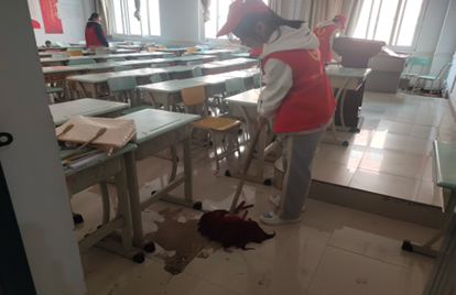 (清理教室地板上的污渍)