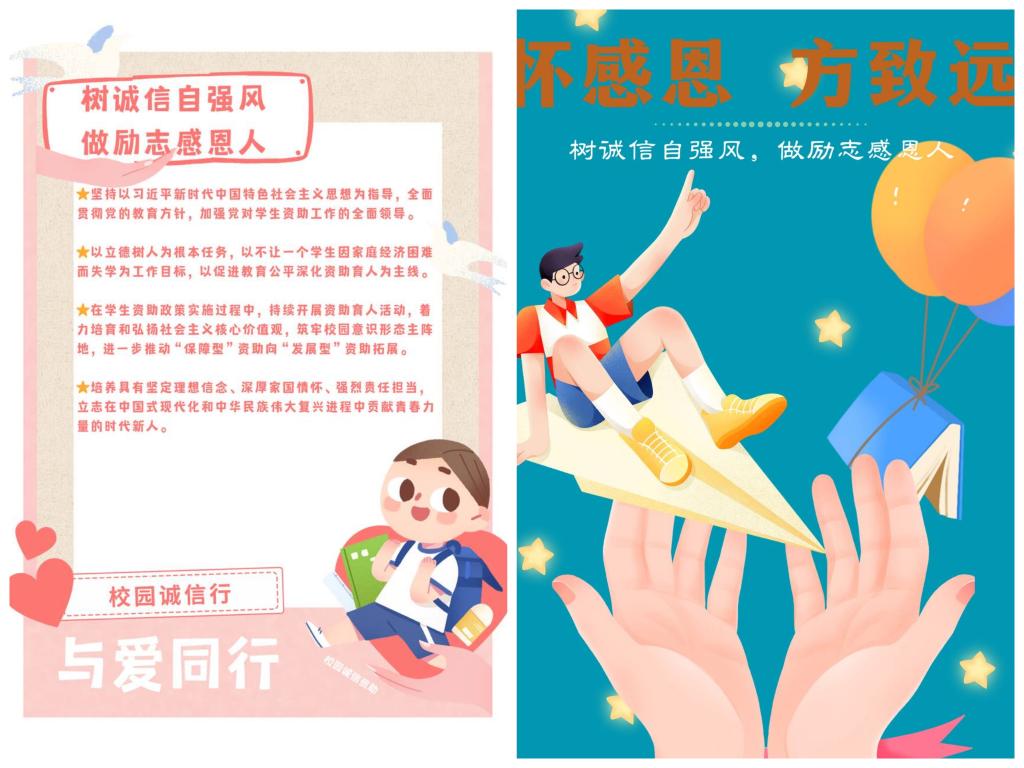 大赛以“树诚信自强风,做励志感恩人”为主题,参赛作品分为平面类和视频类,员工们在本次大赛中充分展现了自己的创意和才华,不仅将对资助政策的理解融入设计作品,而且深刻传达了倡导积极申请资助、感恩诚信、成长成才的意志态度。经公司评审,推选出平面类作品《怀感恩,方致远》《诚信受助,感恩励学》《诚信校园行》《感恩助学,公益共行》和视频类作品《助学 筑梦 铸人》《诚信受助,自立自强》共6个优秀作品参加公司比赛。