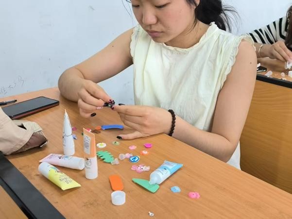 活动当天,心理部精心准备了丰富多样的奶油胶,搭配形态各异的小装饰,有萌趣卡通形象、精致蝴蝶结、闪亮小钻石等等,各个宿舍同学共同根据喜好自由挑选。挤奶油胶的过程是一场沉浸式的心灵SPA,大家全神贯注地投入到创作中,将奶油胶挤出勾勒线条、搭配色彩、填充图案,并摆放可爱的小装饰,当一个个独一无二的发卡逐渐成型,同学们脸上洋溢着满满的成就感和喜悦。大家围坐在一起,一边制作,一边交流创作心得,在创作的乐趣中,暂时忘却烦恼。
