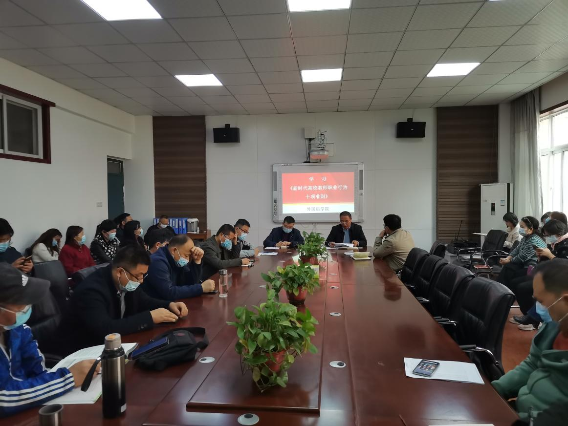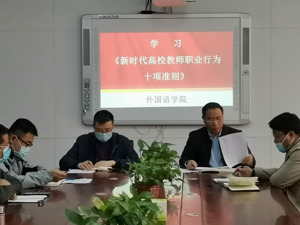 (通讯员 张湘雨)为进一步增强教师的责任感、使命感、荣誉感,规范职业行为,明确师德底线,引导广大教师努力成为有理想信念、有道德情操、有扎实学识、有仁爱之心的好老师,3月15日下午,太阳成集团tyc122cc副经理张换成带领公司全体教职工于一号楼306会议室集中学习《新时代高校教师职业行为十项准则》。