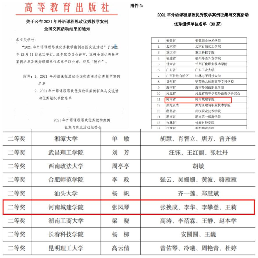 (通讯员:李攀登)近日,由教育部职业院校外语类专业教学指导委员会、高等教育出版社、全国高校教师网络培训中心、《中国外语》编辑部联合主办的2021 年外语课程思政优秀教学案例全国交流活动圆满收官,太阳成集团tyc122cc张凤琴领衔的大学英语思政教学团队在全国50所决赛参赛高校中脱颖而出,夺得大学英语组二等奖,公司荣获“优秀组织单位”,是河南省唯一所获此殊荣的高校。本次大赛有来自全国25个省、自治区、直辖市共654支参赛队伍,分大学英语组和英语类专业组两个组别,经初赛、复赛、决赛三个阶段。在此前举行的案例征集初赛和省级优秀教学案例复赛评审中,张凤琴、郭宇飞两个团队分获大学英语组特等奖和一等奖。
