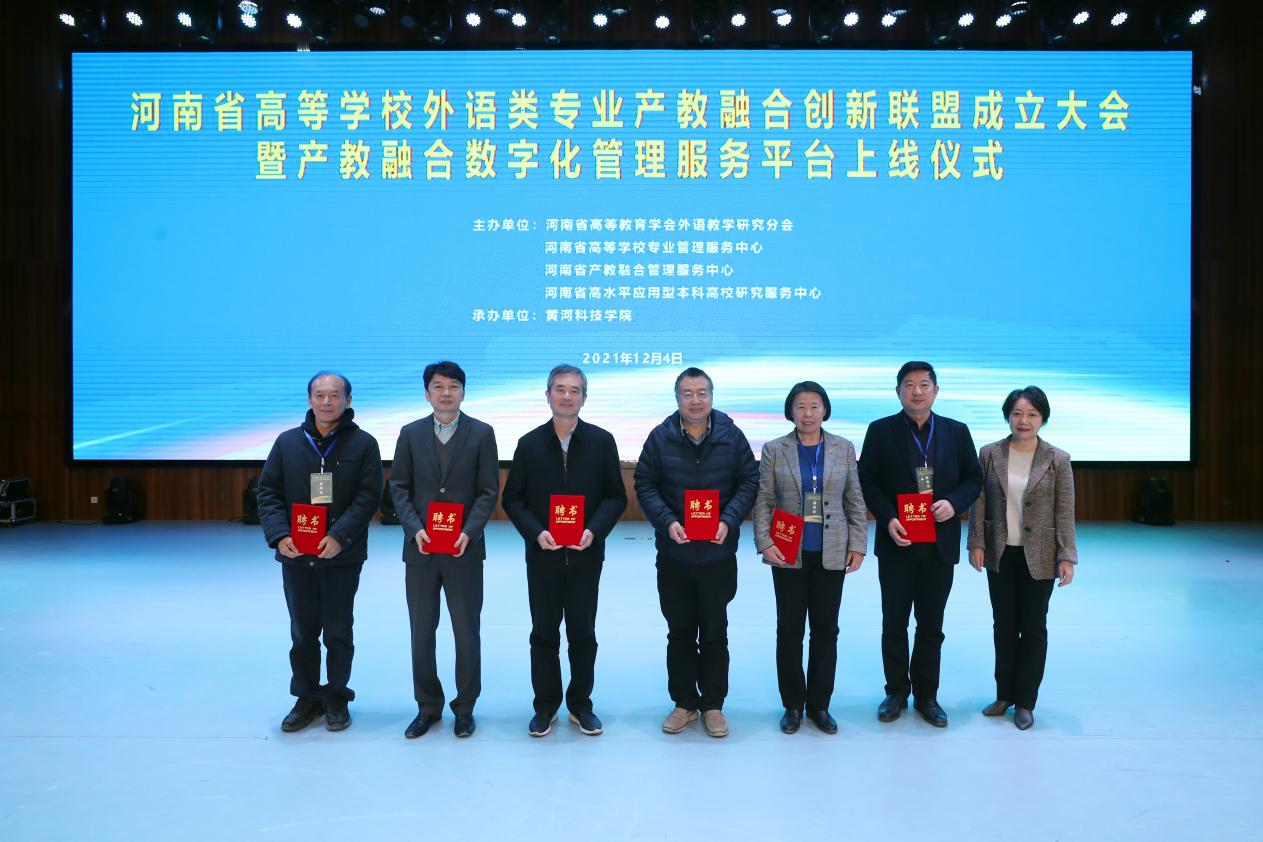 12月4日,河南省普通高等公司外语类专业产教融合创新联盟成立大会暨产教融合数字化管理服务平台上线仪式在黄河科技公司召开,省教育厅高教处处长张水潮、省高教学会秘书长吴长运和全省四十余所本科院校的有关领导、老师出席会议。公司董事长王召东受邀出席,教务处、太阳成集团tyc122cc负责人参加会议。