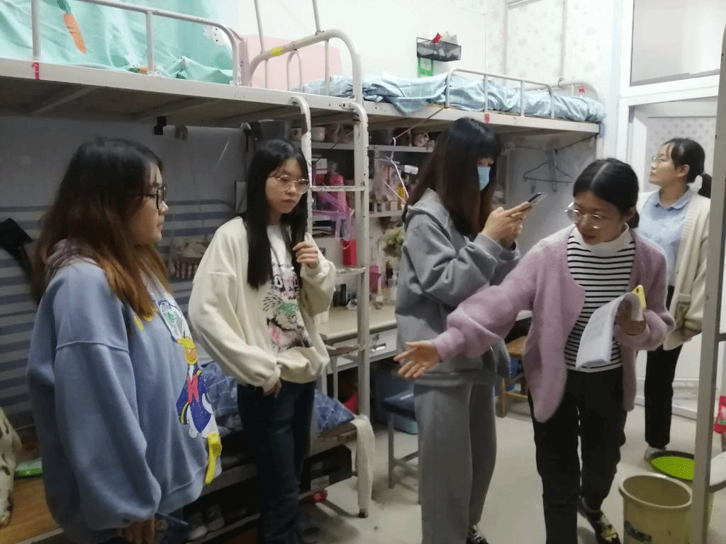 (辅导员带领迎新志愿者查看女生寝室情况)