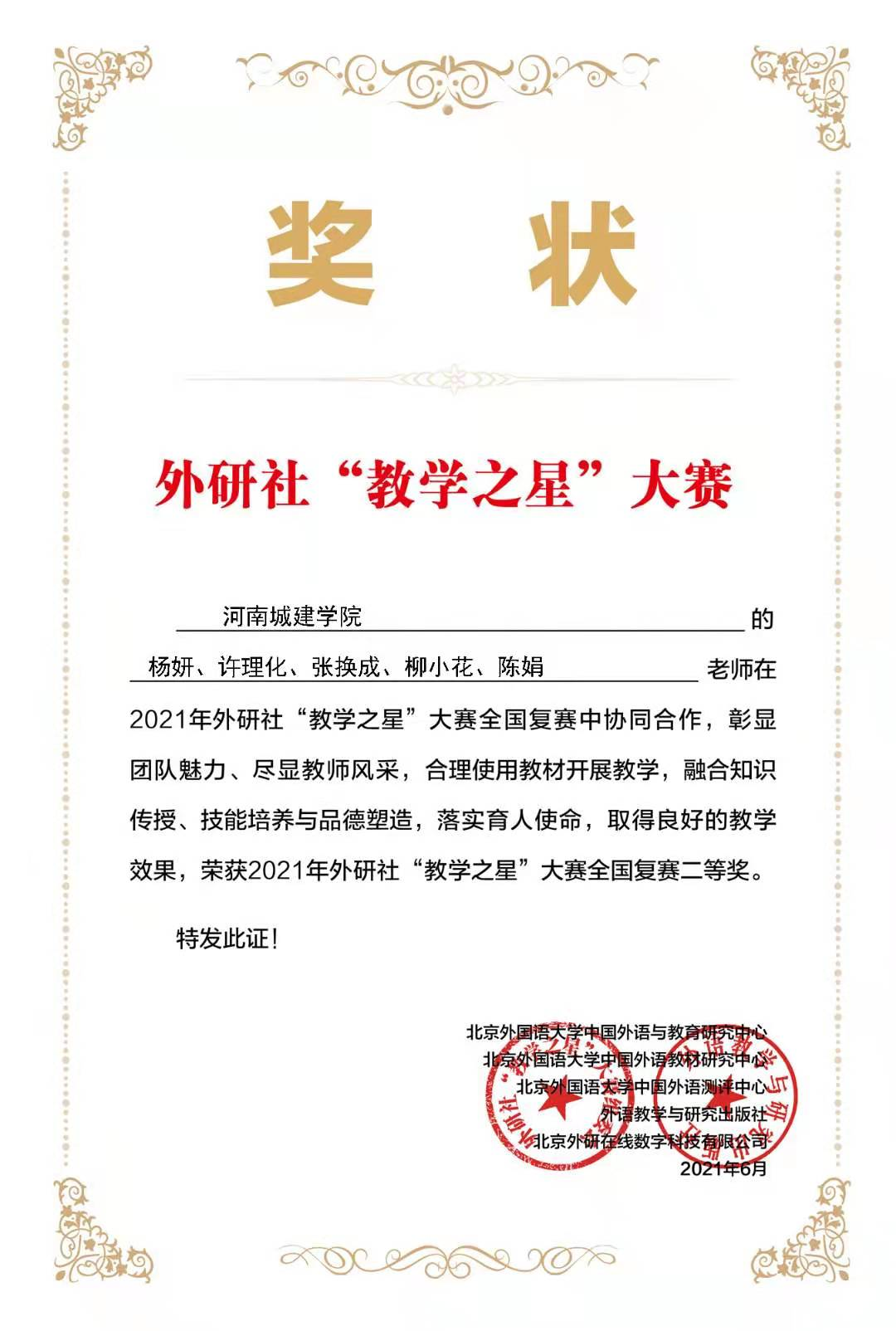 近日,2021年外研社“教学之星”大赛(本科英语组)全国复赛结果揭晓,由公司太阳成集团tyc122cc杨妍、许理化、张换成、柳小花、陈娟老师组建的《基础英语》课程教学团队喜获英语类专业组团队二等奖。