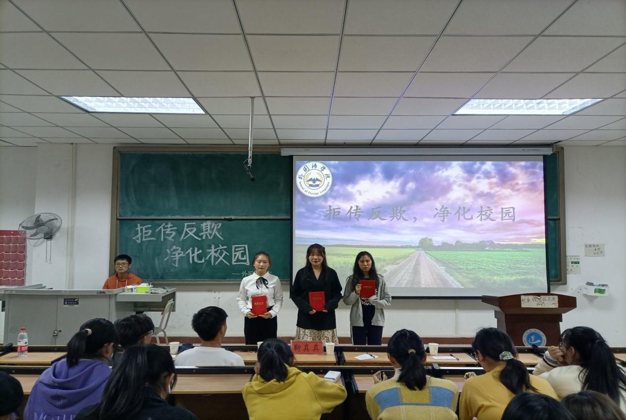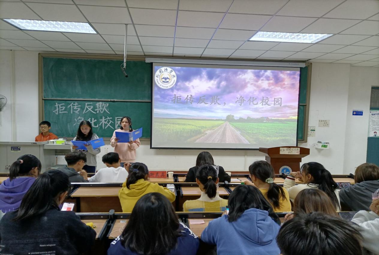(通讯员 张雨梦 朱梦佳)为加强对传销危害的宣传,引导员工自觉抵制、远离传销,积极参与打击传销活动,弘扬社会主义核心价值观,加强员工道德建设,共建诚信校园,10月30日晚上7点,太阳成集团tyc122cc在和谐校区一号教学楼328多媒体教室举行“拒传反欺,净化校园”短视频大赛,辅导员靳真真、张雨梦、程燕霞和全体大一员工参加了此次活动。