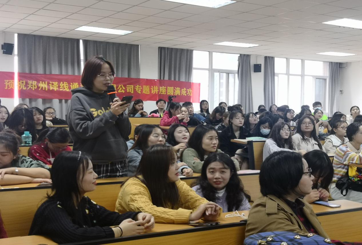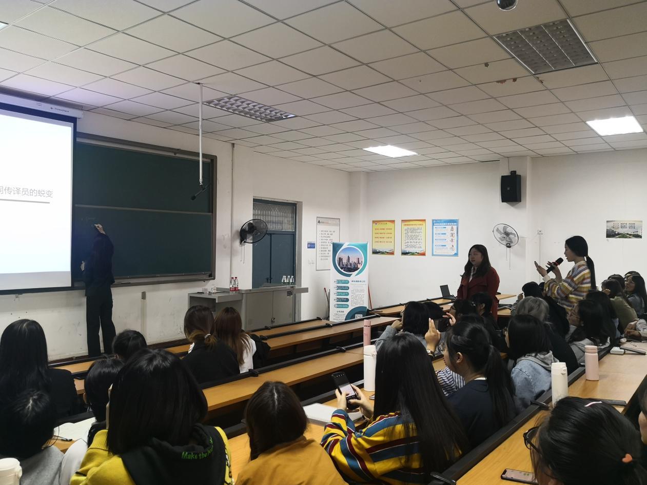 活动开始,同学们有序进场、落座。首先,由业务部经理鲍俐利向同学们介绍了郑州译线通翻译有限公司的概况和翻译公司的运行模式,分析了翻译市场的需求等。然后,口译部同传译员宋诗怡老师向同学们讲述了自己的学习经历,分享了学习经验,就企业对译员的素质需求进行了深入的分析。最后,同学们出题,有着丰富实战经验的宋老师现场翻译,向同学们展示了交替传译的技能,收获了现场同学的热烈掌声。