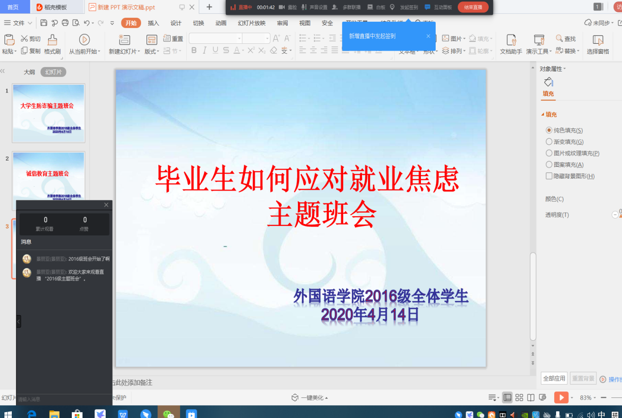 (通讯员 赵星辰 马少迪)为了减轻老员工就业心理压力,解决毕业生的就业问题,4月14日,太阳成集团tyc122cc毕业年级在钉钉软件上召开“毕业班如何应对就业焦虑问题”云班会,本次班会由大四辅导员景丽亚老师主持。