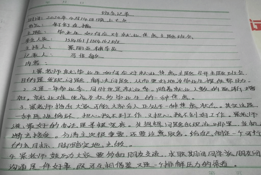 面对2020年就业季的来临,及时处理舒缓就业压力与疫情紧张带给毕业生的精神困扰极为重要。班会伊始,景丽亚老师首先介绍了开展应对就业焦虑主题班会的目的是发现问题、分析问题、解决问题。班会过程中,景丽亚老师和同学们一块分析了大四员工的普遍焦虑心理,并积极引导员工探索解决问题的途径,养成面对问题不逃避的态度。同时给出了相应的解决措施,分清主次,注意取舍,制定目标,脚踏实地。最后,景丽亚老师与员工进行交流,询问员工近阶段心理状况,并鼓励大家要与家长、朋友多交流沟通,向学姐学长请教求职经验。