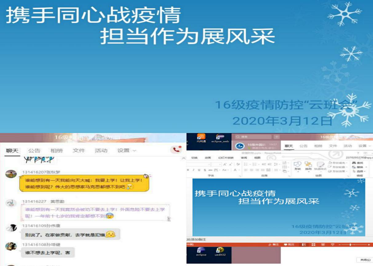 大二辅导员赵星辰老师通过qq群召开“云班会”,他从国内疫情基本得到控制和国外疫情迅猛发展的基本事实给同学们讲述中国特色社会主义制度集中力量办大事的优越性,并结合具体事例和现象给同学们分析了疫情防控阻击战中“中国方案”给世界疫情的贡献,主要包括中国高度、中国广度、中国速度、中国温度四个方面。他向同学们强调了公司疫情防控期间的纪律要求:严格遵守纪律,绝不提前返校;外出计划先请示后行动;每天学工系统APP和省厅系统报平安,一个都不能少;如果身体出现感冒、发烧、咳嗽等任何异常症状及时报告给辅导员;按时上好每一节网络课,要求全体员工遵守疫情防控期间公司的纪律要求。