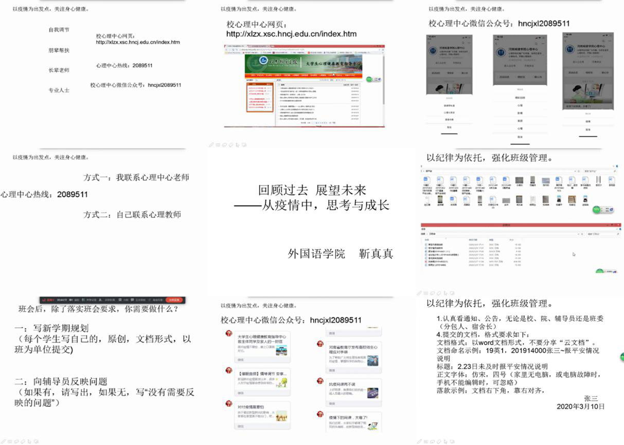 大一辅导员靳真真通过钉钉召开“云班会”,班会的内容主要三个方面:第一,以网课为契机,加强班级学风建设。转专业的同学要及时跟班上课,及时接收群消息,及时反馈问题;对于重修的员工,及时跟班重修并提交对应的申请表;以疫情为出发点,关注自身身心健康,要求大一全体同学学会自我调节,接受朋辈帮扶,寻求长辈老师,咨询专业人士,并告诉同学们校心理中心热线和微信公众号;以纪律为依托,强化班级管理模式,要求全体员工遵守疫情防控期间公司的纪律要求。
