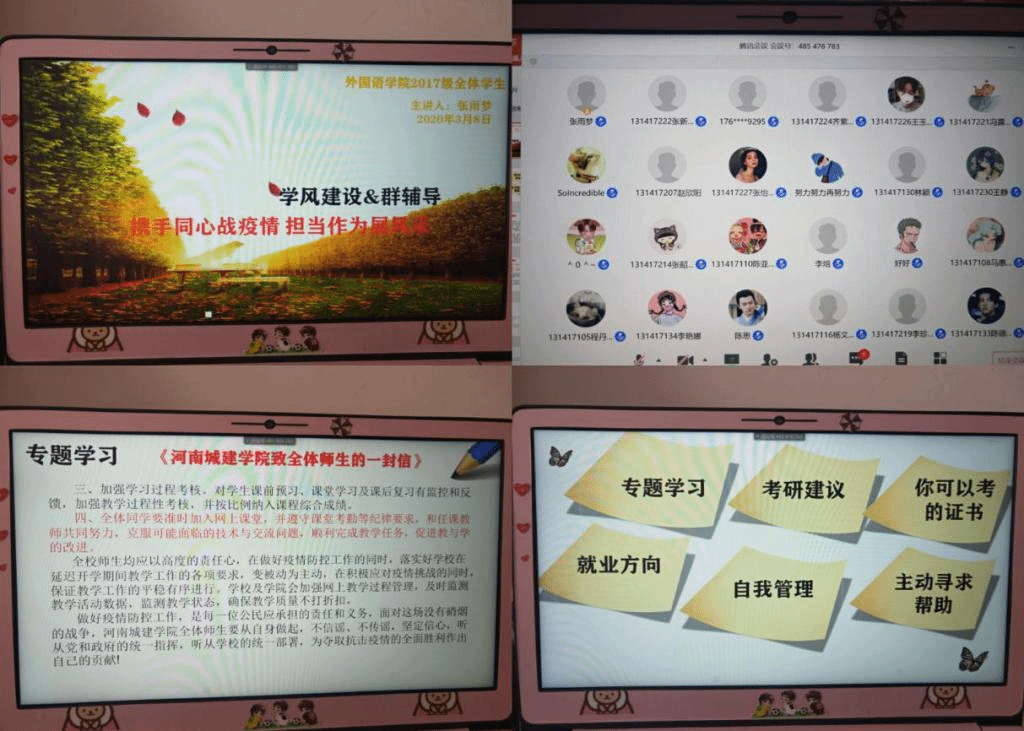 大三辅导员张雨梦通过腾讯会议召开“云班会”,班会的内容主要包括:专题学习、考研建议、必考证书、就业方向、自我管理、主动寻求帮助六大方面,指导同学们在家学会弯道超车,确定自己的就业和考研目标,并及时向大四优秀的学姐学长咨询请教,利用居家时间做好自己的学业和职业生涯规划,要求全体员工遵守疫情防控期间公司的纪律要求。