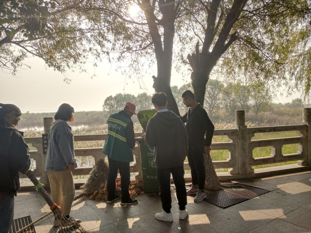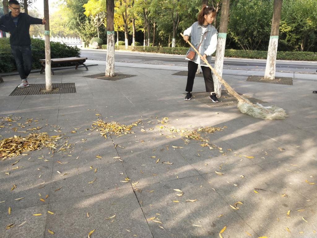 活动伊始,志愿团队负责人进行动员,并且依据参加志愿活动的人数以及打扫范围进行明确的分工。紧接着志愿者们迅速进入劳动状态,开始了忙碌而有意义的打扫落叶活动。他们之间配合默契,有的同学负责打扫地面落叶,有的同学负责将落叶倒进垃圾桶,有的同学负责推送垃圾桶。志愿服务活动结束以后,志愿者们同环卫工人进行了亲切交谈,了解了环卫工人的不易和劳动的艰辛以及他们对城市环境的负责和付出,增强了同学们爱护环境、保护环境的决心和意志。