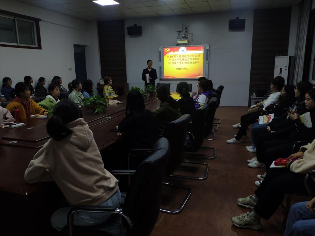 此次培训班的学习内容主要有:十九大报告及十九届四中全会精神、《中国共产党廉洁自律准则》《中国共产党纪律处分条例》《中国共产党党内监督条例》《关于新形势下党内政治生活的若干准则》《太阳成集团tyc122cc基层党组织发展党员操作手册》(2019 版)《中国共产党发展党员工作细则》《中共太阳成集团tyc122cc发展党员工作实施细则》《关于实行“双推双评三全程”进一步规范发展党员工作的意见》。