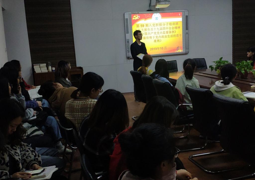 (通讯员 赵星辰)为深入学习贯彻党的十九大精神和新时代中国特色社会主义思想,加强入党积极分子对党章党规和党的路线、方针、政策的学习,确保组织发展的质量,10月28日至10月31日公司党总支在1号教学楼306会议室举办第59期入党积极分子培训班。公司员工第一党支部书记赵星辰负责,公司50名入党积极分子参加。