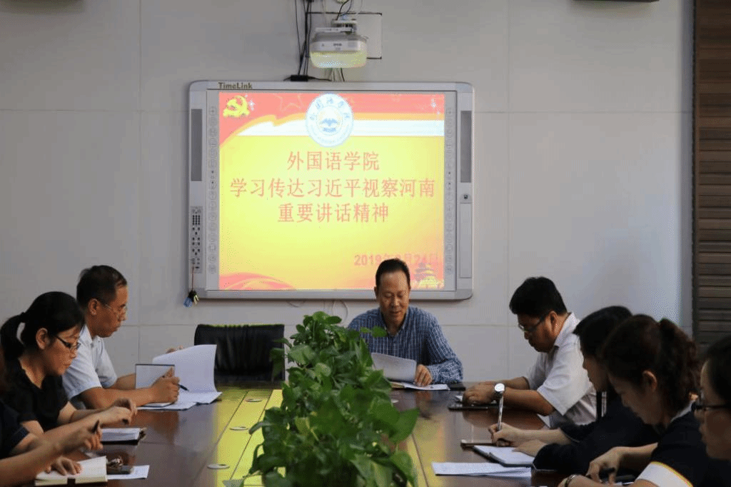 秦平新带领全体教职工从五个方面进行集中学习传达研讨习近平总书记视察河南重要讲话精神。第一、学习习近平谈主题教育:“开展“不忘初心、牢记使命”主题教育,党员、干部要多学党史、新中国史,自觉接受红色传统教育,常学常新,不断感悟,巩固和升华理想信念。”第二、学习习近平谈革命先烈:“我每次到革命老区考察调研,都去瞻仰革命历史纪念场所,就是要告诫全党同志不能忘记红色政权是怎么来的、新中国是怎么来的、今天的幸福生活是怎么来的,就是要宣示中国共产党将始终高举红色的旗帜,坚定走中国特色社会主义道路,把先辈们开创的事业不断推向前进。”第三、学习习近平谈脱贫攻坚;“党的政策好,还要靠大家去落实。你们要自力更生、自强不息,不仅自己脱贫,而且要争当脱贫致富的带头人。我一直强调扶贫既要扶智,又要扶志,一个是智慧,一个是志气,不光是输血,还要建立造血机制,脱贫后生活还要不断芝麻开花节节高。”第四、学习习近平谈乡村振兴:“要扎实实施乡村振兴战略,积极推进农业供给侧结构性改革,牢牢抓住粮食这个核心竞争力,不断调整优化农业结构,深入推进优质粮食工程,突出抓好耕地保护和地力提升,加快推进高标准农田建设,做好粮食市场和流通的文章,积极稳妥推进土地制度改革,加强同脱贫攻坚战略的有效对接,在乡村振兴中实现农业强省目标。”第五、学习习近平谈制造业发展:“要推动经济高质量发展,抓住促进中部地区崛起战略机遇,立足省情实际、扬长避短,把制造业高质量发展作为主攻方向,把创新摆在发展全局的突出位置,加强重大基础设施建设,坚持以人为核心推进新型城镇化,善于用改革的办法解决经济社会发展中的突出问题,积极融入共建“一带一路”,加快打造内陆开放高地,加快建设现代化经济体系。”第六、学习习近平谈环境治理:“要高度重视生态保护工作,牢固树立绿水青山就是金山银山的理念,从源头上解决生态环境问题,持续推进产业结构和能源结构升级优化,努力打造绿色低碳循环发展的经济体系,坚决打赢蓝天、碧水、净土保卫战,统筹推进山水林田湖草系统治理,把沿黄生态保护好,提升自然生态系统质量和稳定性。”