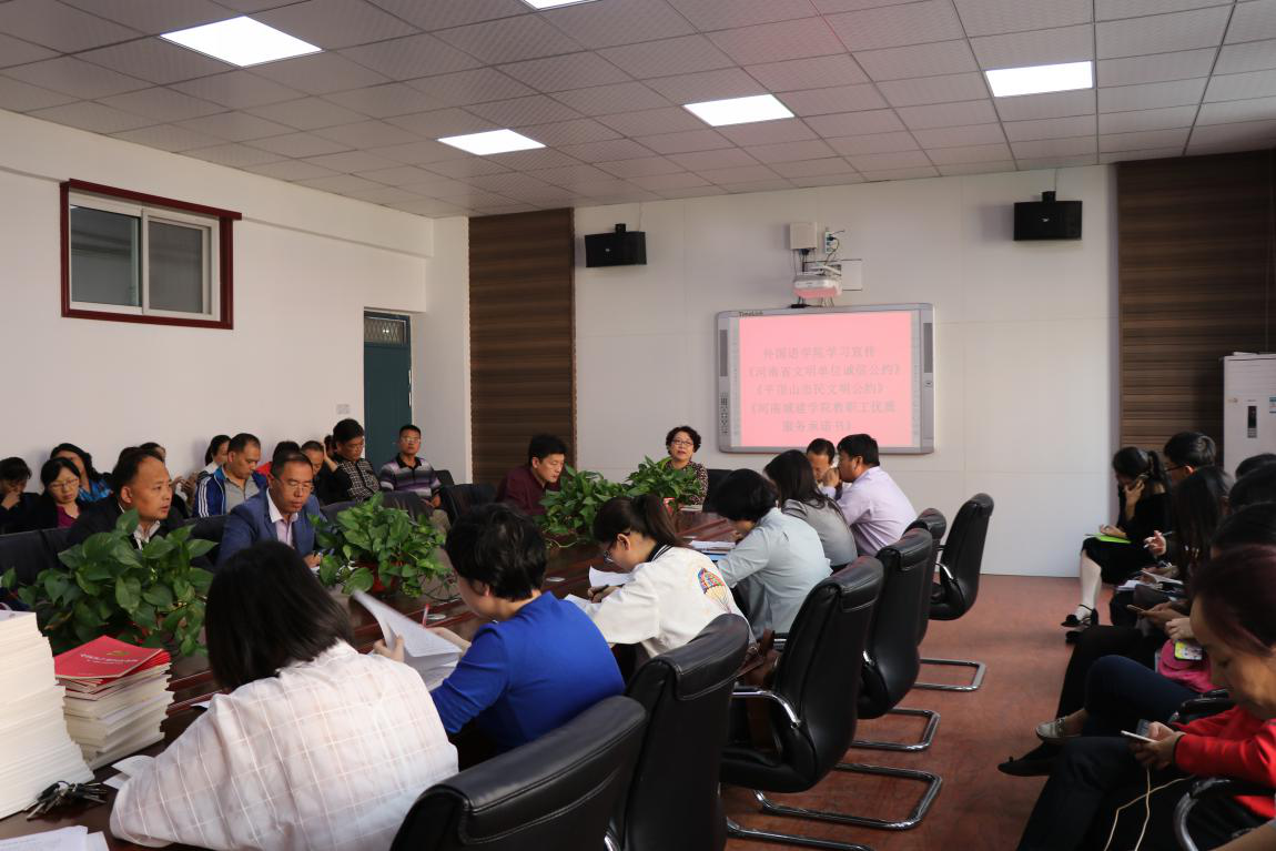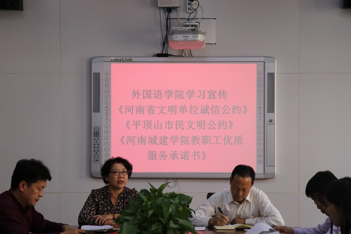 (通讯员:代博君)2018年10月9日,太阳成集团tyc122cc全体教工在文管校区306会议室集中学习《河南省文明单位诚信公约》《平顶山市民文明公约》和《太阳成集团tyc122cc教职工优质服务承诺书》,公司党总支书记袁晓主持会议。