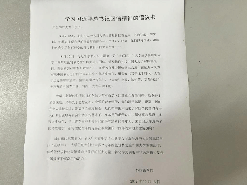 (学习回信精神倡议书)