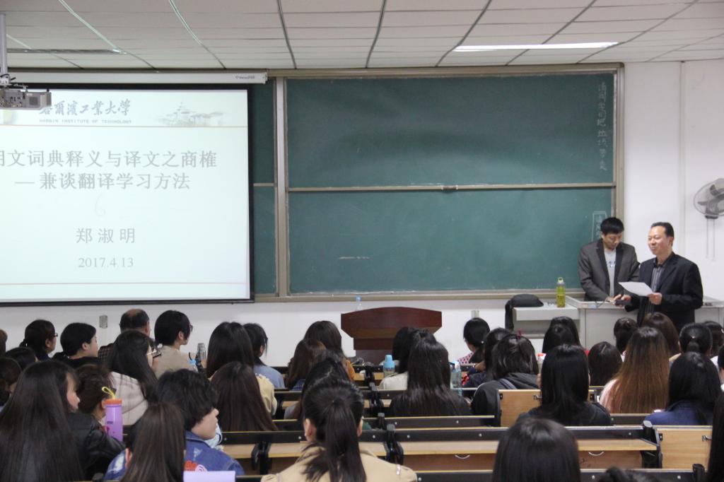 讲座中,郑淑明以《朗文当代高级英语辞典》(英英•英汉双解第4版)为例,从词典概述、朗文词典释义与译文之商榷、翻译学习方法等三个方面进行了生动详实的解读。讲座结束后,郑淑明还就提升教师文化修养、强化教师职业道德以及报考哈尔滨工业大学研究生应注意的事项等问题和现场的师生进行了深入交流。