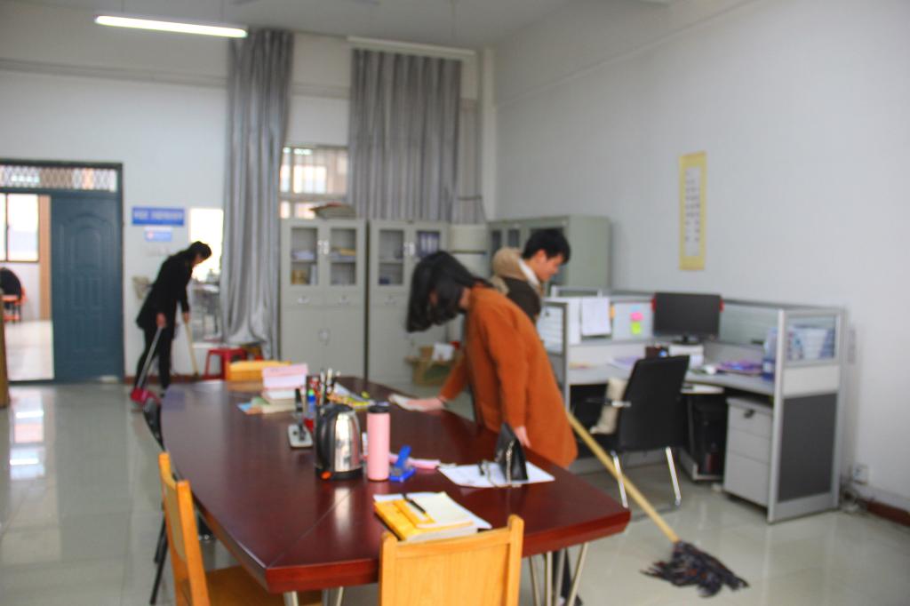 下午一点半,所有员工干部及志愿者在306会议室集合完毕,员工会主席门海月简单为大家介绍活动意义并明确打扫范围为1号教学楼三层所有教室以及会议室、办公室,还指定负责人带领大家打扫。所有人员就绪,大家热火朝天地行动起来,所有志愿者摆放桌椅、清扫垃圾,拖地,大家分工明确,认真地打扫着各个角落,动作轻快麻利,很快就完成了分配好的任务。志愿者们还发扬互帮互助精神,询问隔壁班级是否需要支援,伴随着劳动的还有大家的欢声笑语。随着打扫渐进尾声,各个教室都变得更加整洁明亮,活动在大家合影留念中圆满结束。