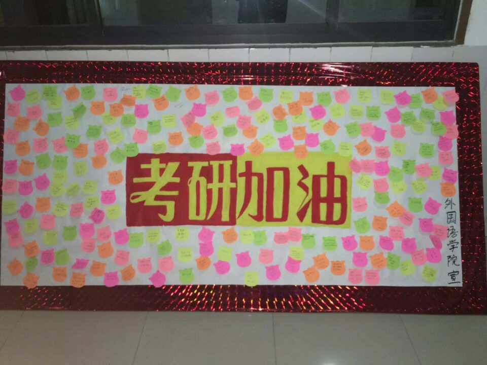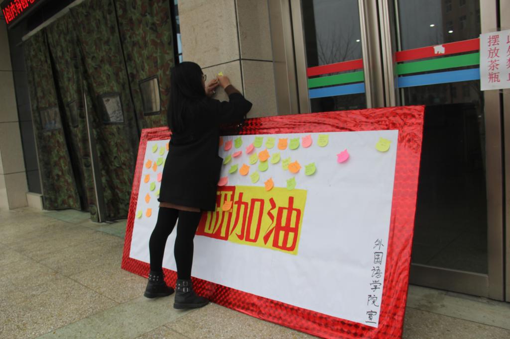 “一句话为考研加油”活动为考研同学们加油打气,使他们积极面对考研,勇于完成挑战。通过留下加油语的方式,不仅增强了参加考研同学们的自信心,更体现了同学们对考研学长学姐们的关心与关爱。