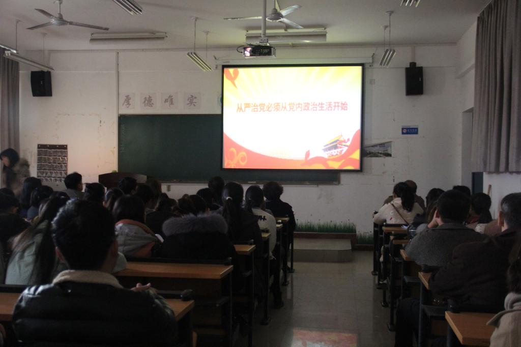 袁晓书记首先指出,中共十八届六中全会已圆满结束,主要议题为全面从严治党,要求每位党员做到认真学习,严于律己。接下来,通过“从严治党的必要性”、“开展党内政治生活的发展历程”、“修订党内监督条例正当其时”等五个视频让大家全面学习十八届六中全会的会议精神。所有与会人员都聚精会神观看视频,并认真做好笔记。视频播放完毕,袁晓书记对所有师生党员再次强调,要认真执行“三会一课”制度,各支部书记更要按要求做好会议记录。并着重要求员工党员,不仅要思想上入党,更要行为上入党,加强党员意识,切身履行党员职责,做好带头作用。此次会议圆满结束。