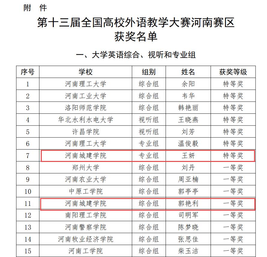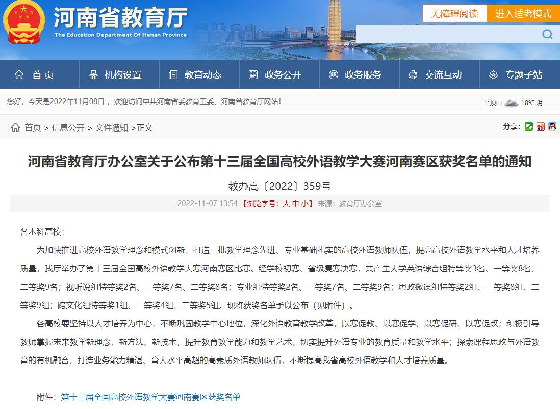 11月7日,河南省教育厅下发《河南省教育厅办公室关于公布第十三届全国高校外语教学大赛河南赛区获奖名单的通知》(教办高〔2022〕359号),公司太阳成集团tyc122cc王妍和郭艳利两位老师表现突出,分别荣获省英语专业组决赛特等奖和大学英语综合组决赛一等奖,实现了公司在此项全国性赛事上的历史性突破。这也是继去年获得微课组省赛决赛二等奖后,又一次在该项赛事中斩获佳绩。