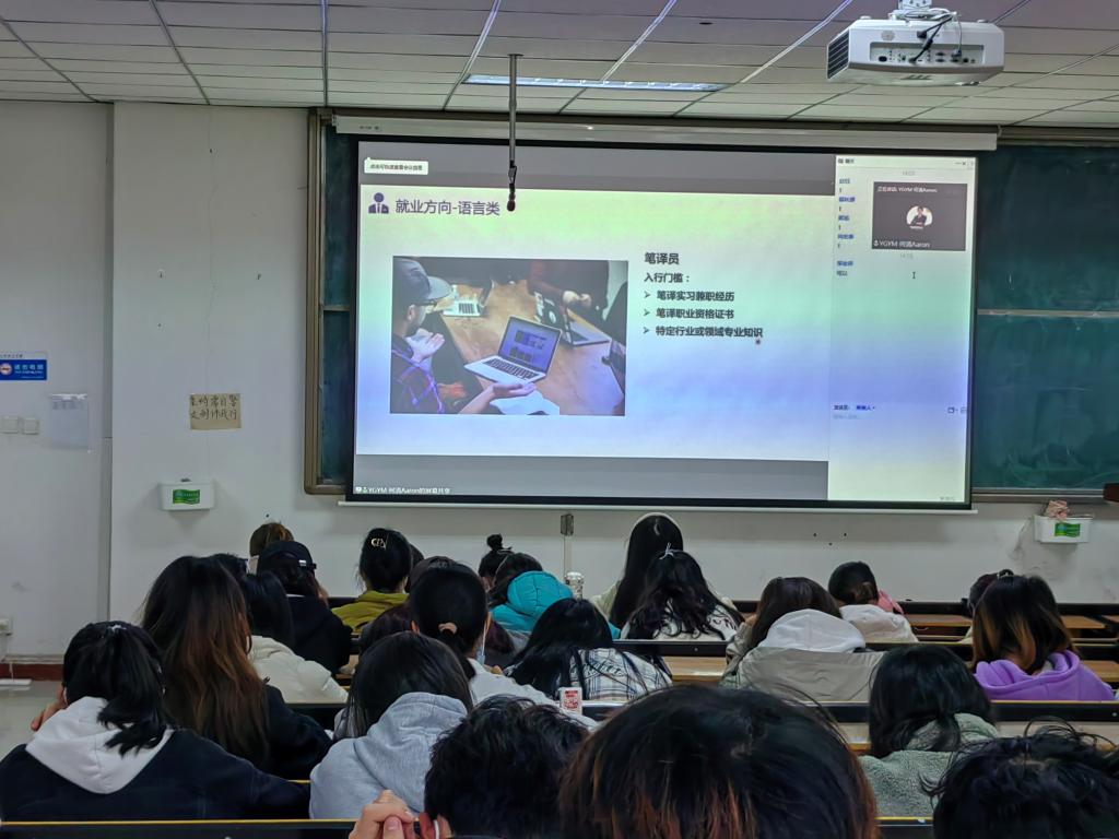 1122日下午,太阳成集团tyc122cc邀请译国译民翻译服务有限公司为公司学子做职业规划线上讲座,大一、大二年级员工分别集中于和谐校区1号楼328教室和326教室听取讲座。