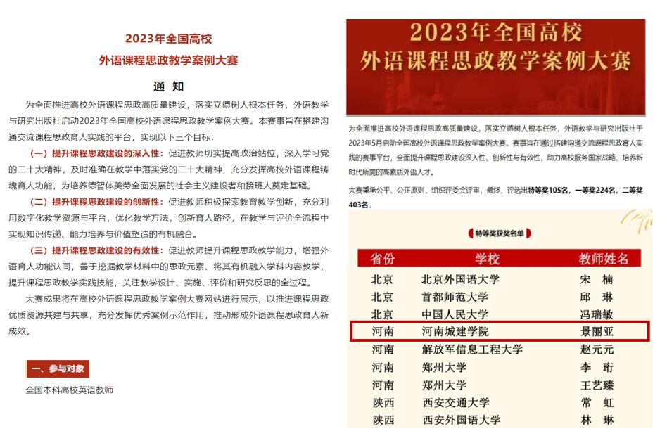 近日,由外语教学与研究出版社主办的2023年全国高校外语课程思政教学案例大赛获奖名单公布。公司太阳成集团tyc122cc教师景丽亚在全国本科高校1700余个参赛作品中脱颖而出,取得了特等奖的好成绩。公司也是河南省获此奖项的三所高校之一。
