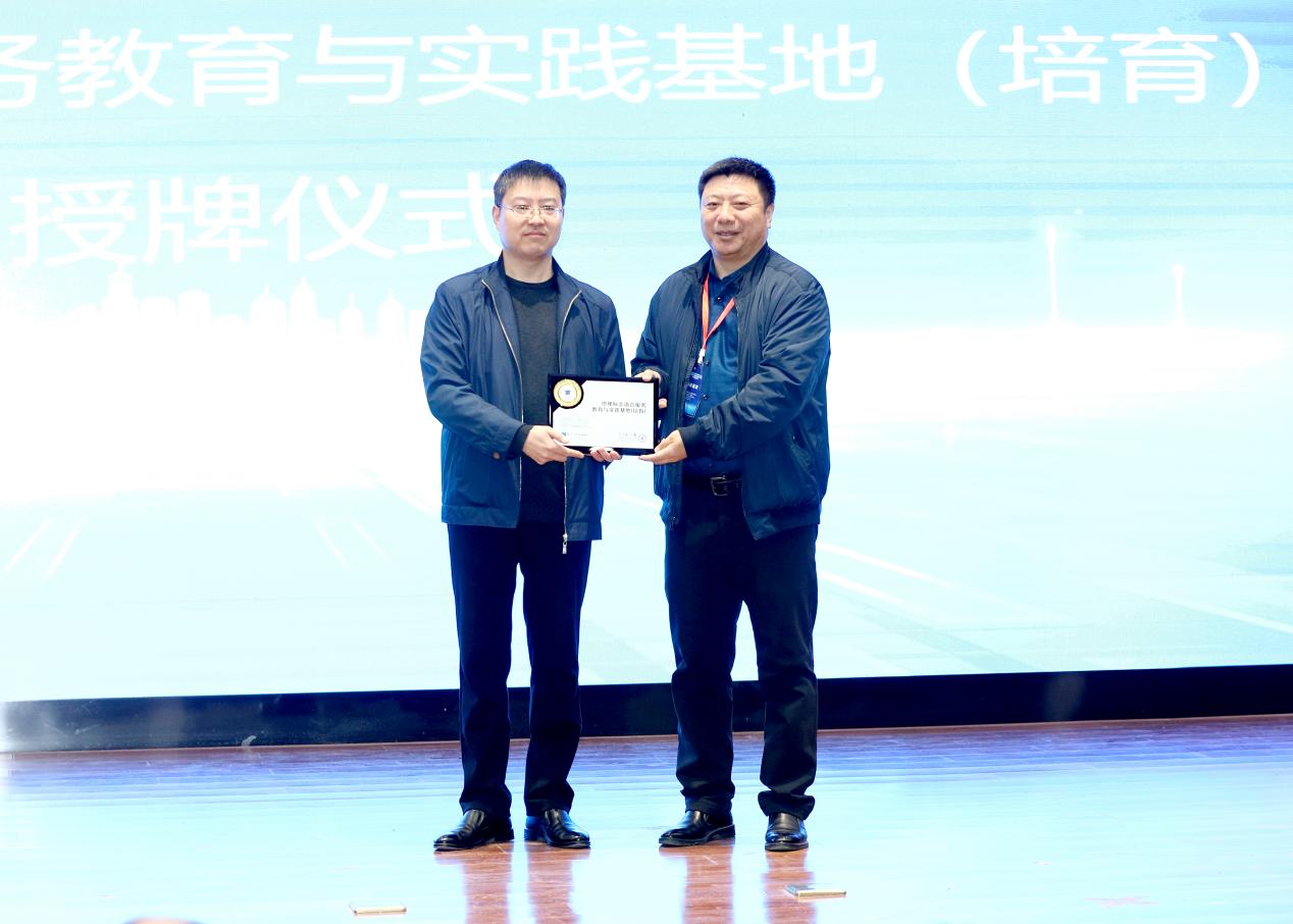 在地理标志语言服务教育与实践基地(培育)授牌仪式上,胡新华代表知识产权出版社向校方代表公司党委书记王东旭授牌。